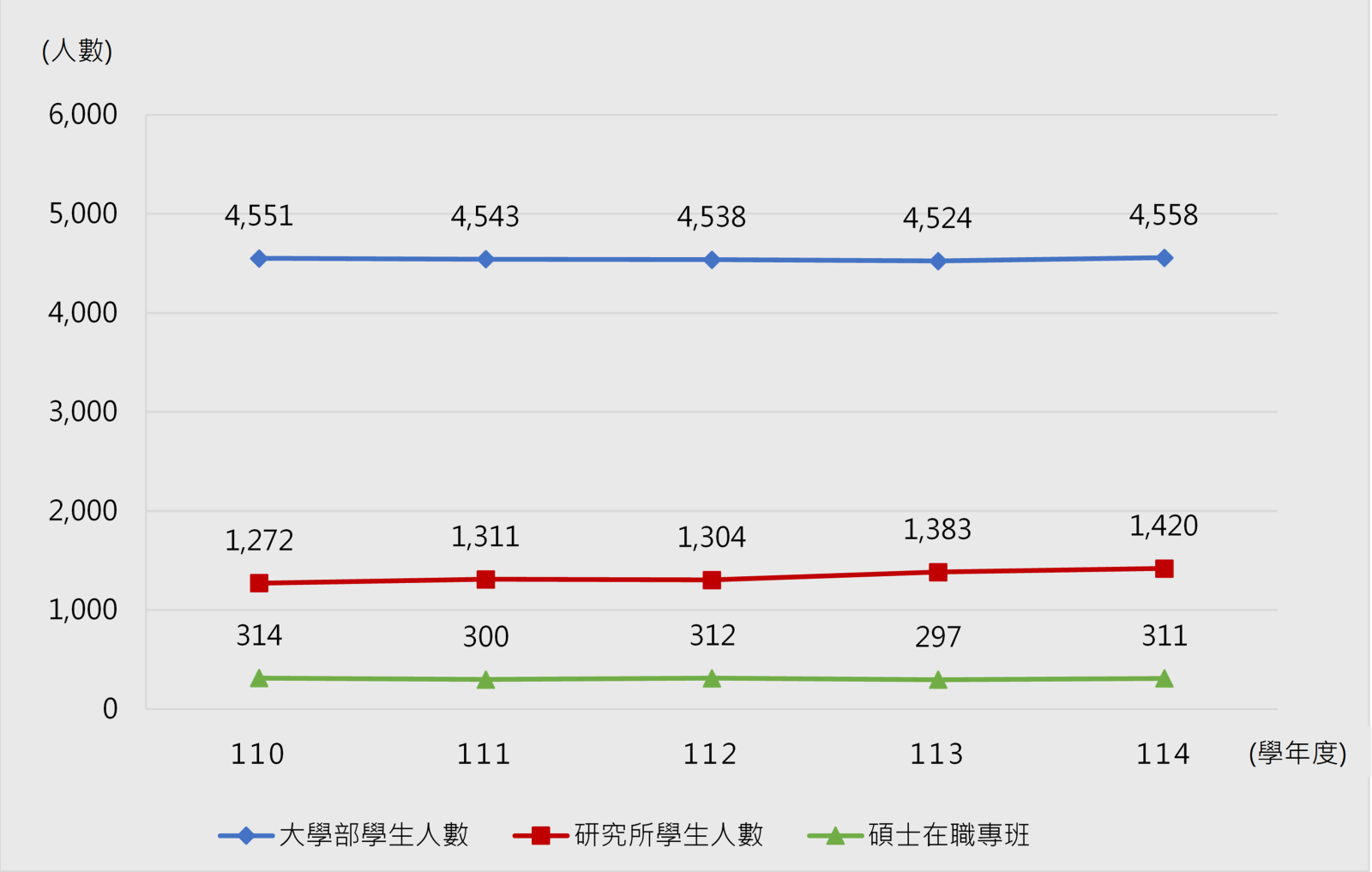 ◎ 近5年學生人數(分大學部、研究所及在職專班)與變動趨勢圖