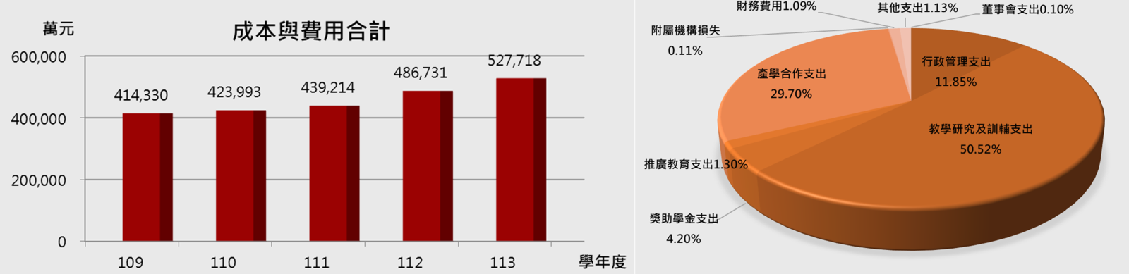 109~113學年度總支出41.43億元至52.77億元,各項支出亦逐年成長,主要係因產學合作收入、補助及受贈收入及其他收入增加,支出相對增加,總支出平均成長率為6.3%。