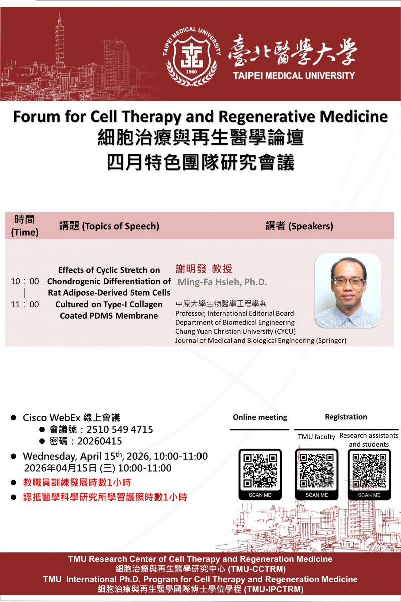 「細胞治療與再生醫學」 為臺北醫學大學 4+2+X 重點發展特色研究領域之一。本月論壇非常榮幸邀請到 中原大學生物醫學工程學系 謝明發教授,與各位先進分享他在幹細胞研究領域的最新見解。