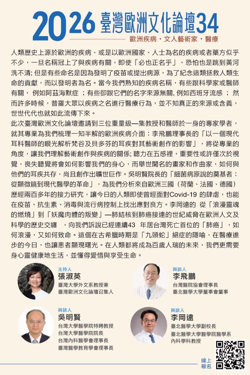 第34屆「臺灣歐洲文化論壇」即將於 5/16 登場!本次特別邀請三位醫學界的重量級導師,帶領我們從專業醫師的視角出發,穿梭在顯微鏡的革命、藝術創作的耳疾之謎,以及橫跨世紀的肺部疾病史。