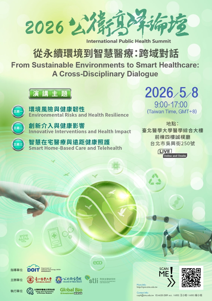 面對氣候變遷與數位轉型的雙重挑戰,公共衛生已是一場跨越國界與學門的集體行動!臺北醫學大學公共衛生學院今年特別主辦「2026公衛高峰論壇:從永續環境到智慧醫療—跨域對話」,邀請來自英國、義大利、澳洲等國際頂尖學者,以及台灣在地專家,與我們一同探討如何打造具備高度韌性的健康未來。