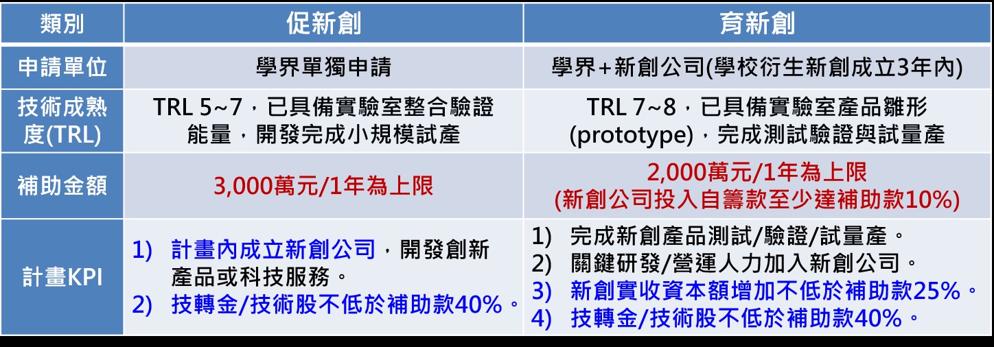 曾接受科技部「新型態產學研鏈結計畫」及「科研創業計畫-拔尖案」、經濟部「產學研價值創造計畫」補助者,排除其以同一開發內涵/新創公司再申請價創2.0。例:如曾接受價創1.0補助之學校,偕同前所衍生之新創公司,以不同技術申請「育新創」樣態計畫,亦屬排除之列。