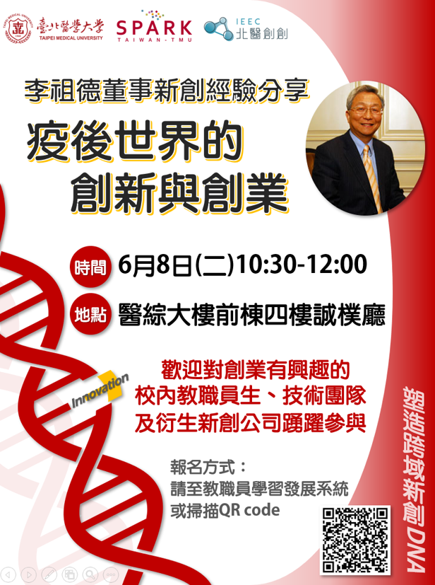 特邀李祖德董事分享多年來的新創經驗,為後輩及有興趣創業的團隊經驗傳承與交流,歡迎大家踴躍報名! 時間:110/6/8(二) 10:30-12:00 地點:醫綜前棟大樓四樓 誠樸廳 歡迎對創業有興趣的校內教職員生、技術團隊及衍生新創公司踴躍參與 本課程認列教職員學習時數1.5小時! 報名網址:登入 教職員工學習發展系統 → 點選 課程連結 非教職員:報名連結