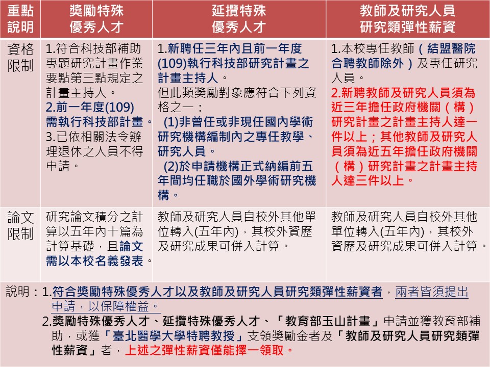 六、 凡符合「臺北醫學大學延攬及獎勵特殊優秀人才措施支給辦法」申請資格者,需先申請本項補助後始得申請本校教師及研究人員研究類彈性薪資。本項補助與特聘教授、教師及研究人員研究類彈性薪資、獎勵特殊優秀人才、玉山計畫五者獎勵僅能擇一領取。