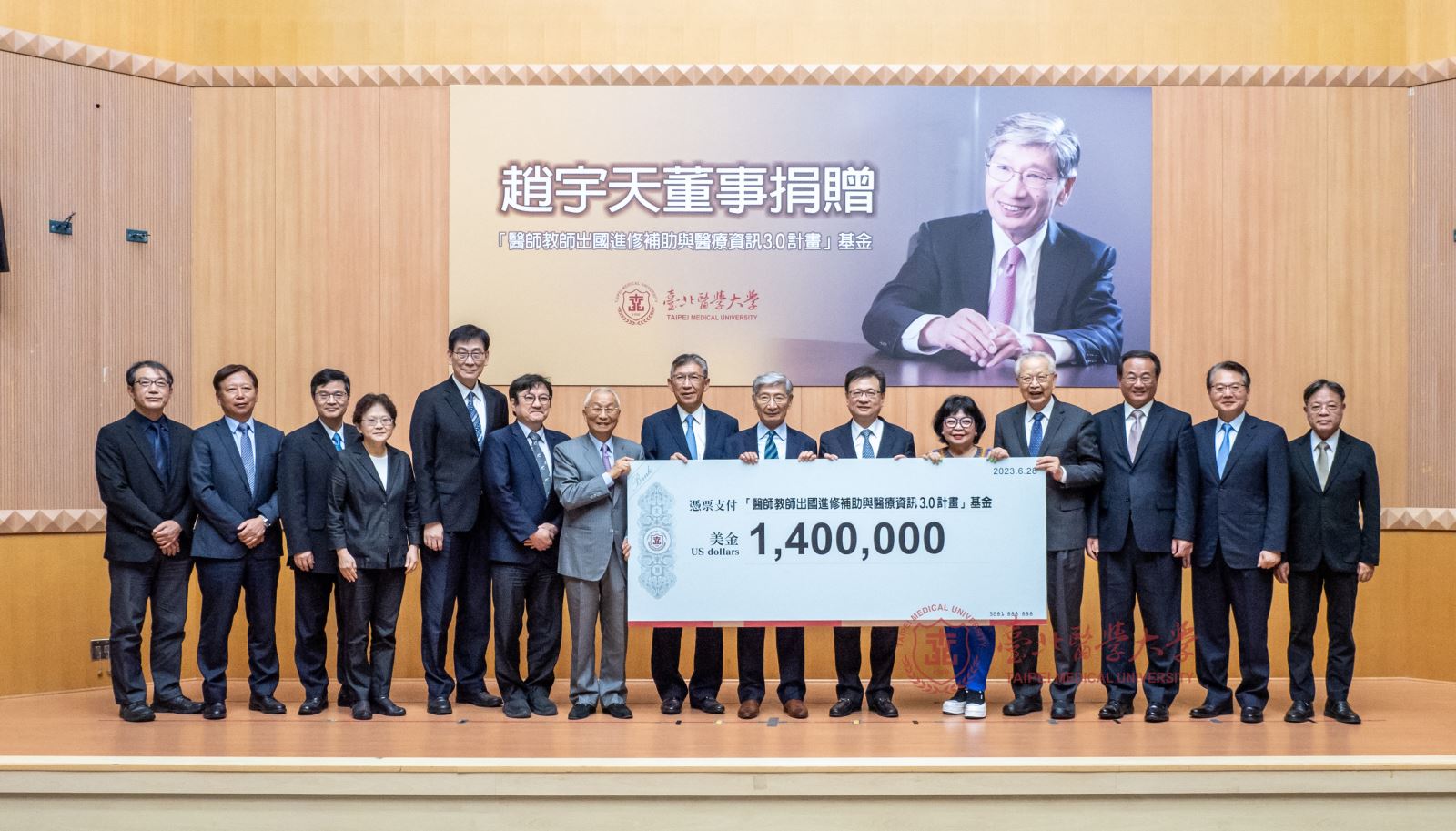 臺北醫學大學今(28日) 舉辦捐贈儀式,感謝趙宇天董事捐贈140萬美元(相當新台幣4300萬餘元)給母校,挹注北醫大體系一校六院的醫師/教師出國進修計畫及北醫大體系醫療資訊系統3.0計畫,幫助母校培育人才與數位發展。