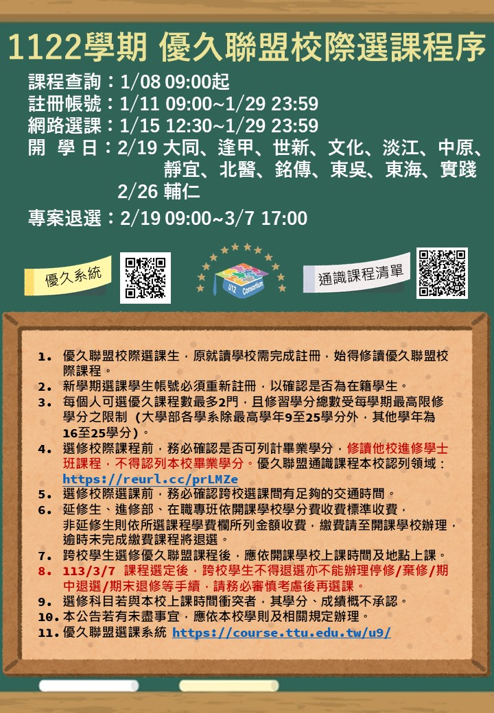 112學年度第二學期優久聯盟跨校選課作業開跑囉!選課時程及說明請見下方海報。