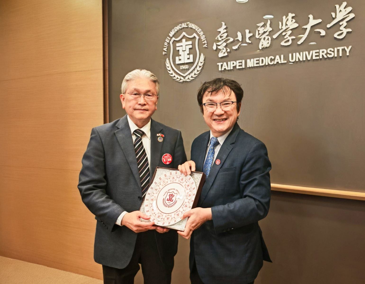 圖說:北醫大吳麥斯校長(右)與大阪中華學校葉俊麟副理事長(左)互贈紀念品。