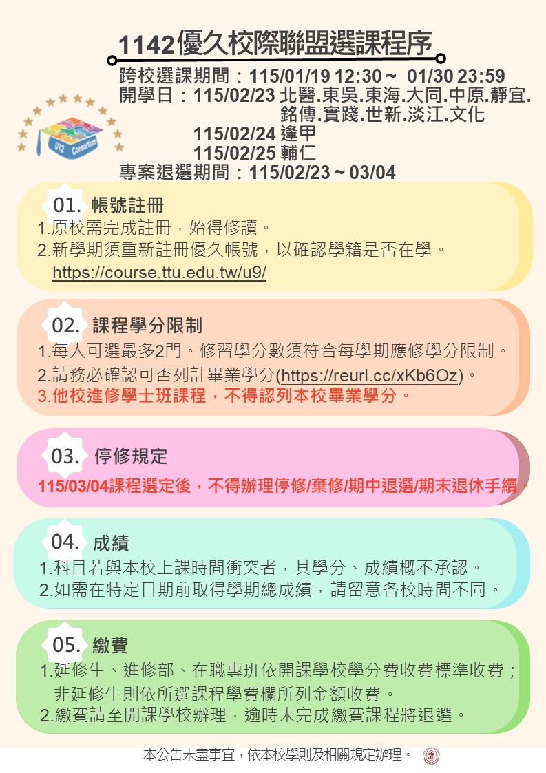 114-2學期優久聯盟跨校選課作業開跑囉~選課時程及說明請見下方海報。
