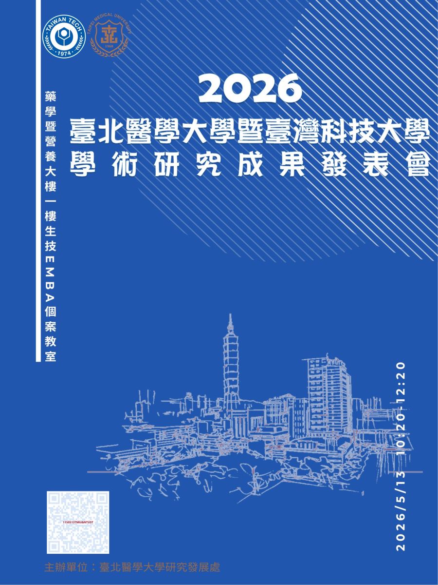 研究發展處訂於115/5/13(三)10:20-12:20(10:30開幕)假本校信義校區藥學暨營養大樓一樓生技EMBA個案教室舉辦「2026年臺北醫學大學暨臺灣科技大學學術研究成果發表會」,竭誠歡迎報名參加,進行跨校學術研究交流,活動議程請詳見附件。